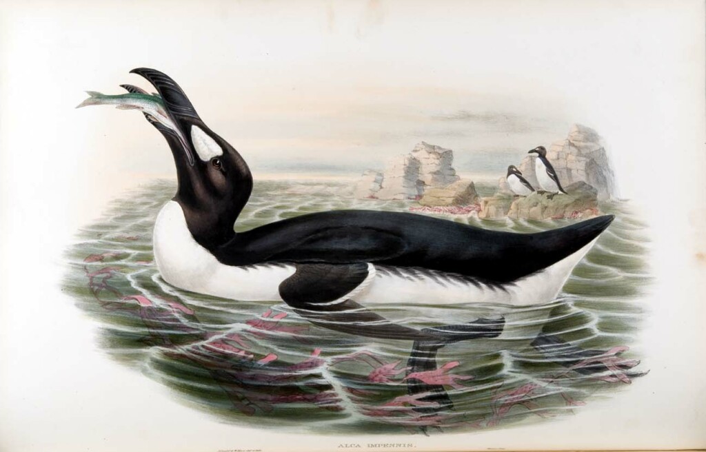No more than one or two scholars and ornithologists ever saw a Great Auk Pinguinus impennis alive. This was in part because when it was realised, in about 1800, that the bird was extremely rare, the ensuing scientific stampede for museum skins- and the chance for dealers to make a quick and lucrative killing- drove the species to extinction by 1844.