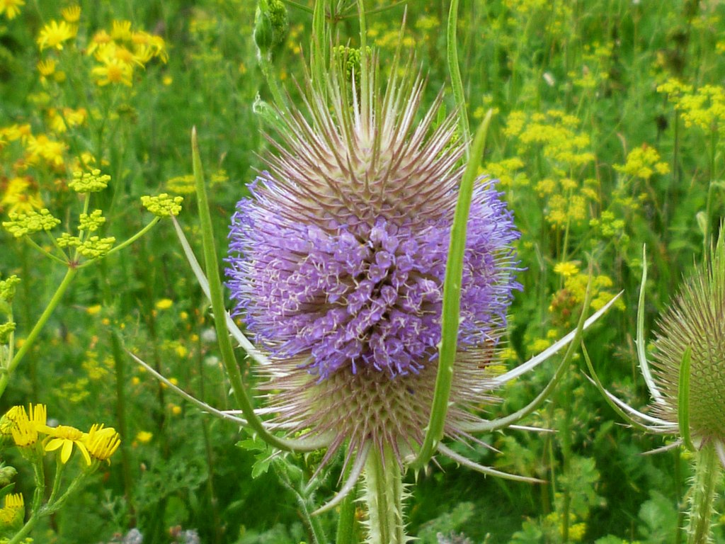 As one of our most stately and distinctive plants, the Wild Teasel (or Teazle) Dipsacus fullonum is a familiar sight, frequently found in marginal habitats and often found rowing in gardens. Its forests of tall stems are topped with insect-covered flowers in summer, and in winter the seedheads attract flocks of Goldfinch Carduelis carduelis. But there is more to these plants than just birds and bees, not least as there are two teasels that compete for the name D. fullonum