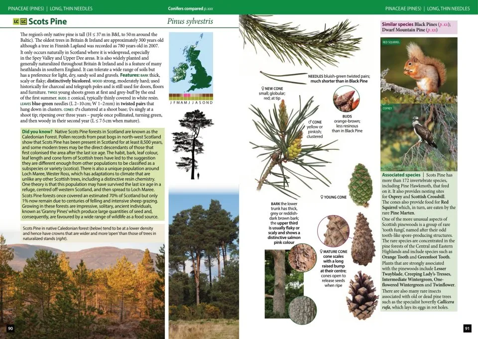 Each tree is well illustrated with excellent photographs of key characteristics, and there is a distribution map and often a drawing of tree shape. This is backed up by boxes with similar species and how to differentiate them. Closely related species often have side by side illustrations of differences. If you have never been quite sure how to tell Austrian pine Pinus nigra ssp. nigra, a common ornamental tree, from Corsican Pine P. nigra ssp. laricio, used in forestry, then look no further.
